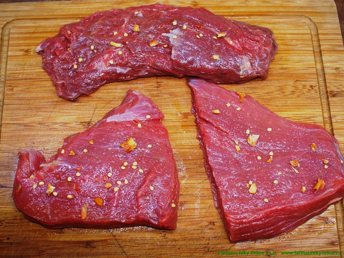 Nebojte se dostatečně silných plátků, klidně vybírejte kousky o síle až 2,5 cm. Tepelně upravené pak budou uvnitř pěkně červené. Takové maso nikdy nerozklepávejte paličkou, naopak by si mělo zachovat původní struktru.